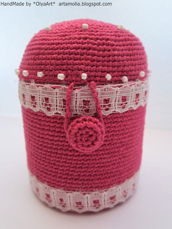 Обвязывала столбиками б/н.,ничего особенного,в общем-то))Крышку также обвязала,набила ватой,и пришила ткань.Немного бисером украсила и кружевом.Очень удобная штучка,можно и что-то мелкое хранить,и как игольницу использовать.